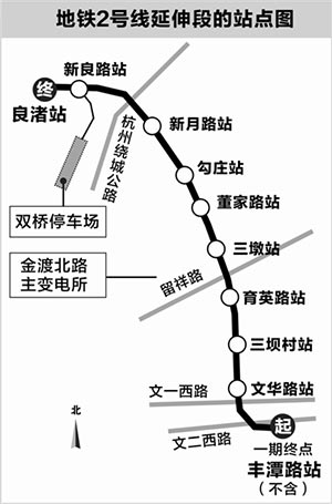 地铁2号线二期将建设车站9座,由南往北分别为:文华路站、三坝村站、育英路站、三墩站、董家路站、勾庄站、新月路站、新良路站、良渚站。此外,还将建双桥地铁列车停车场一处,金渡北路主变电所一座。