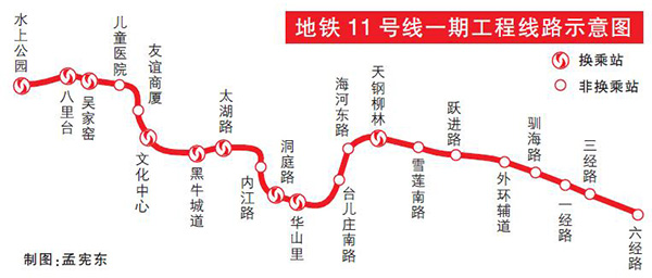 天津地铁11号线为中心城区东西向骨干线,一期工程线路西起南开区复康路与水上公园西路交口的水上公园站,东至东丽区津塘二线与六经路交口的六经路站,正线全长22.6公里,共设车站21座。分别为:水上公园站、八里台站、吴家窑站、儿童医院站、友谊商厦站、文化中心站、黑牛城道站、太湖路站、内江路站、洞庭路站、华山里站、台儿庄南路站、海河东路站、天钢柳林站、雪莲南路站、跃进路站、外环辅道站、驯海路站、一经路站、三经路站和六经路站。