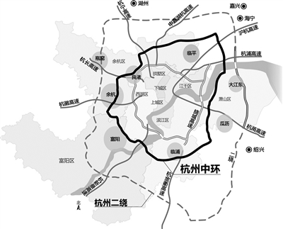为促进“一主三副六组团”与主城的融合发展,未来在杭州的“一绕”(绕城高速公路)、二绕(绕城高速公路西复线,预计2020年全线贯通)之间,还将出现一条“三绕”,也就是规划新增的组团联络环线(中环)。
