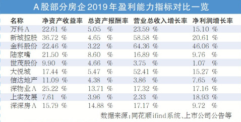 记者梳理发现,A股上市房企中,多家房企总资产回落率连年下降。2016年保利地产总资产回报率5.73%,到2018年已经降到5%以下。金地集团该指标也从2016年的7.58%下降到2018年的5.93%。金科股份净资产回报率2019年虽然高达22.46%,但总资产回报率只有3.22%,净利润与营业收入之比低于10%。